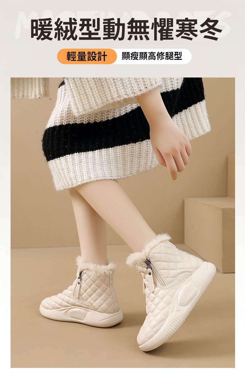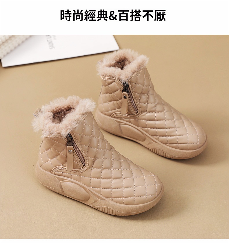 仿履帶齒紋,冰面防滑, 自發熱鞋墊,三檔調溫,超高厚底,隔絕地面寒氣,全密封防水膜,防滲水